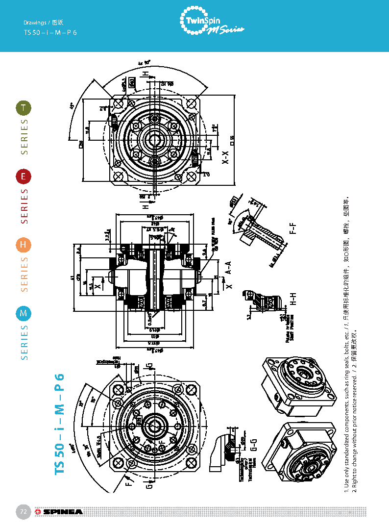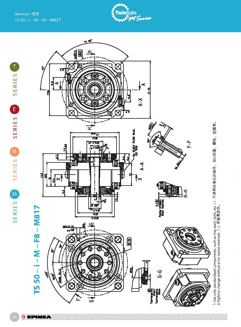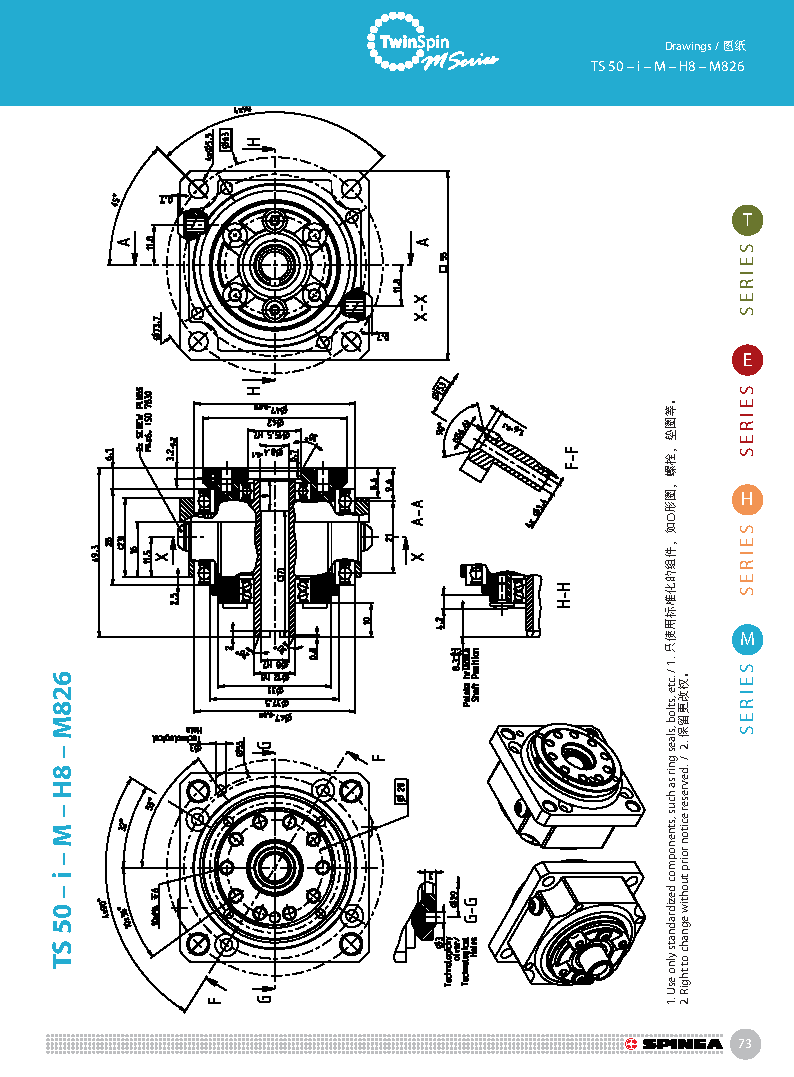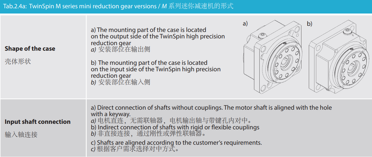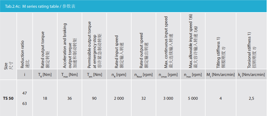 M 系列是最小型號的Twinspin高精度減速機,以TS50為代表。未來我們將推出更小的型號為M系列增加成員。 M系列減速機保留了SPINEA減速機所有的優(yōu)點,我們可以驕傲的說,M系列代表了市面上同類型的最優(yōu)秀的減速機。 減速機內(nèi)注有終生免維護油脂,由輸出端的密封球軸承(2RS)保證油封;在輸入端也應用了同樣的軸承(輕微的潤滑油泄漏為容許現(xiàn)象)。SPINEA也可根據(jù)客戶的要求提供完全密封的減速機。 同其他系列相同,獨特的設計可以把負載直接安裝在減速 機輸出法蘭上,省去輸出端的額外軸承。