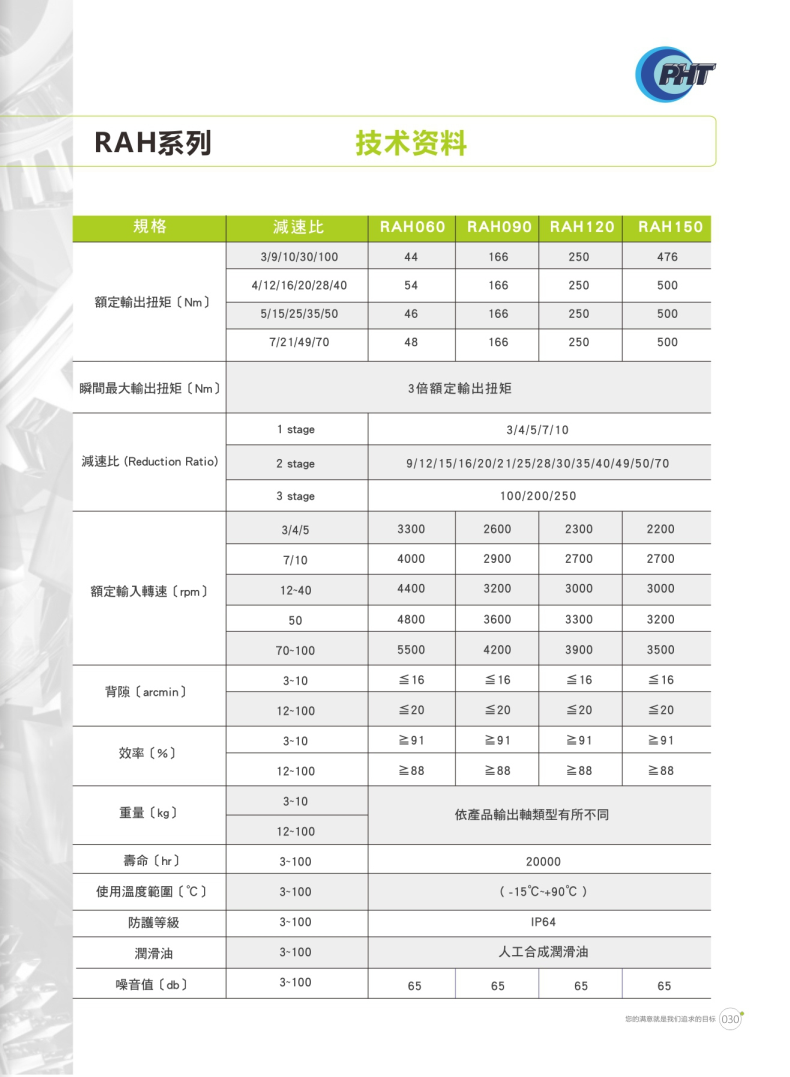 RAH系列是品宏轉角減速機系列。 鋁合金材質可提高散熱能力,減緩溫升現象造成影響。 多樣化的出力軸可因應各種場合,客制化的入力端可搭配各式馬達。 提供各式特色之減速機,供使用者依需求選購。 特殊油封設計,正常使用下不需保養亦不用更換潤滑油,可延長使用壽命。 各式特色,體積小,省空間,噪音低,輸出扭矩高,安裝容易,可搭配馬達型號廣泛。 RAH搭配DM,一體成型的齒輪組,可有效的減低噪音。 RAH搭配DH,最佳的性價比,可廣泛應用于各種場合。
