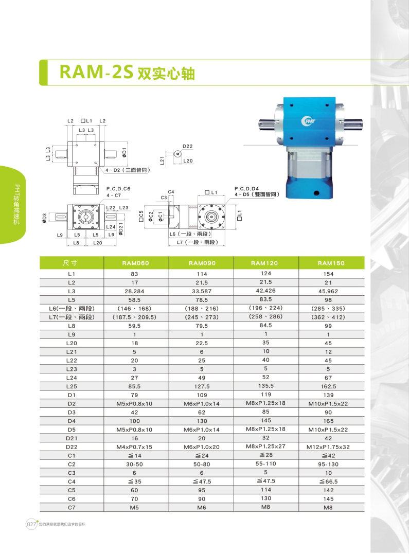 PHT(品宏行星減速機) RAM-2S系列是雙實心軸設(shè)計。 鋁合金材質(zhì)可提高散熱能力,減緩溫升現(xiàn)象造成影響。 多樣化的出力軸可因應(yīng)各種場合,客制化的入力端可搭配各式馬達。 提供各式特色之減速機,供使用者依需求選購。 特殊油封設(shè)計,正常使用下不需保養(yǎng)亦不用更換潤滑油,可延長使用壽命。 各式特色,體積小,省空間,噪音低,輸出扭矩高,安裝容易,可搭配馬達型號廣泛。 RAM搭配DM,一體成型的齒輪組,可有效的減低噪音。 RAM搭配DH,最佳的性價比,可廣泛應(yīng)用于各種場合。