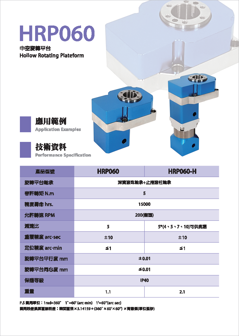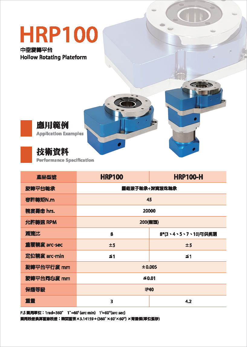 HRP系列是品宏轉(zhuǎn)角減速機(jī)系列。 可搭配伺服馬達(dá)或減速齒輪箱,提供使用者多種選擇。 工作平臺(tái)可直接與工件配合,提高便利性。 旋轉(zhuǎn)平臺(tái)為中空軸設(shè)計(jì),適用于配管之場(chǎng)合。 定位精度小于1弧分,重復(fù)精度可達(dá)±5弧秒,增加產(chǎn)品之穩(wěn)定性。 各式優(yōu)點(diǎn)可讓產(chǎn)品應(yīng)用層面更加廣泛。