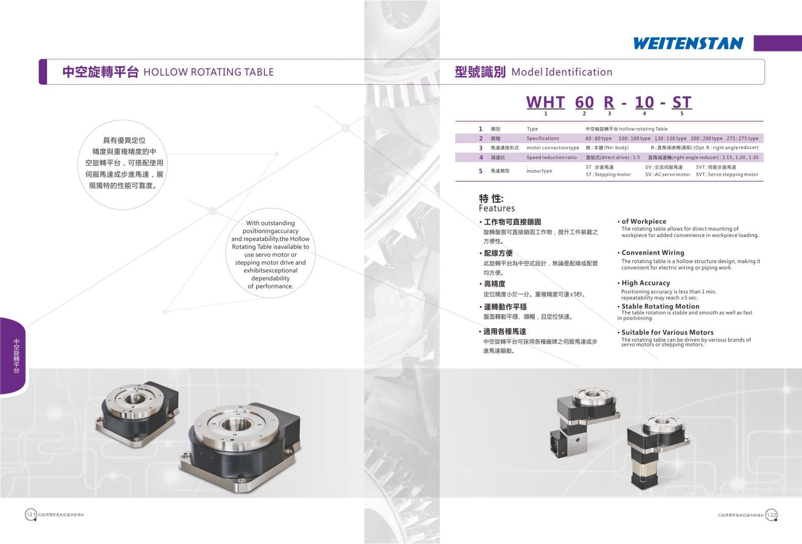 WHT系列中空旋轉平臺。 具有優異定位精度與重復精度的中空旋轉平臺,可搭配使用伺服馬達或步進馬達,展現獨特的性能可靠度。 工作物可直接鎖固。旋轉盤面可直接鎖固工作物,提升工件裝載之方便性。 配線方便。此旋轉平臺為中空式設計,無論是配線或配管均方便。 高精度。定位精度小于1分。重復精度可達±5秒。 運轉動作平穩。盤面轉動平穩,順暢,且定位快速。 適用各種馬達。中空旋轉平臺可采用各種廠牌之伺服馬達或步進馬達驅動。